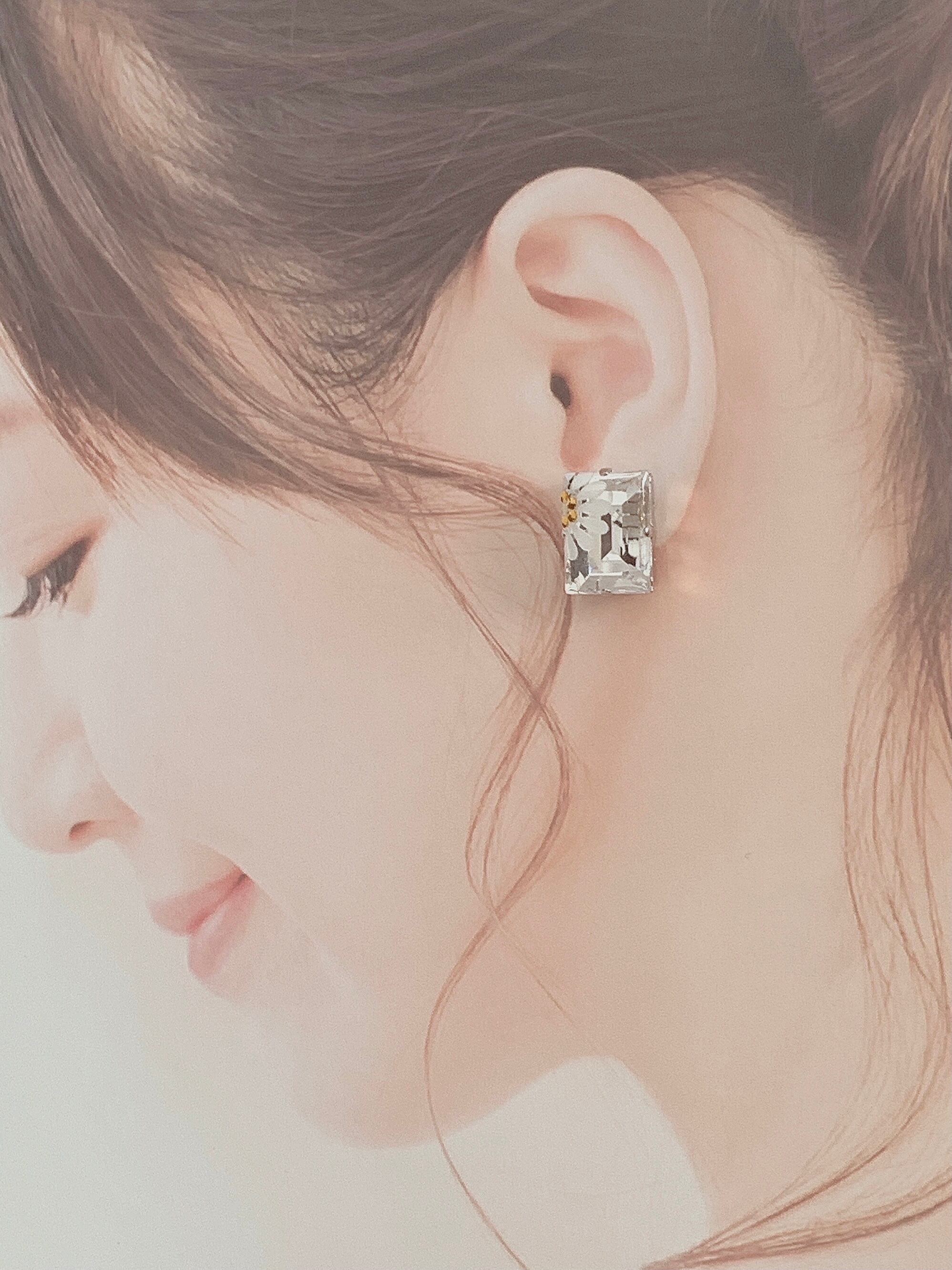 シャープな印象の長方形のクリスタルにキラキラ輝くイエローのクリスタルをポイントにマーガレットの花のような模様を描きました。