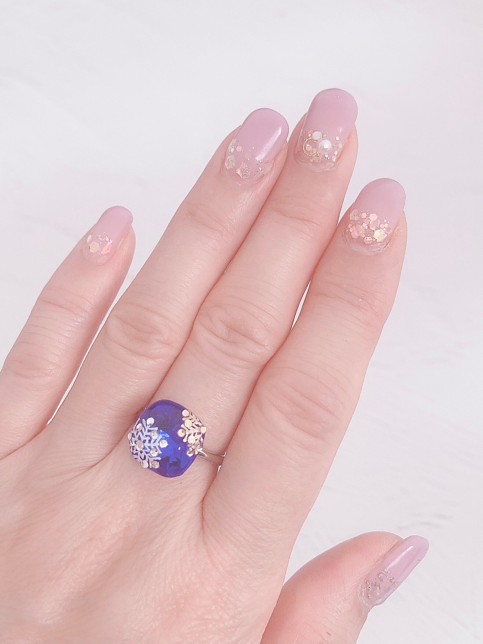 スクエアのクリスタルに雪の結晶を描き、細かなクリスタルを散りばめました。