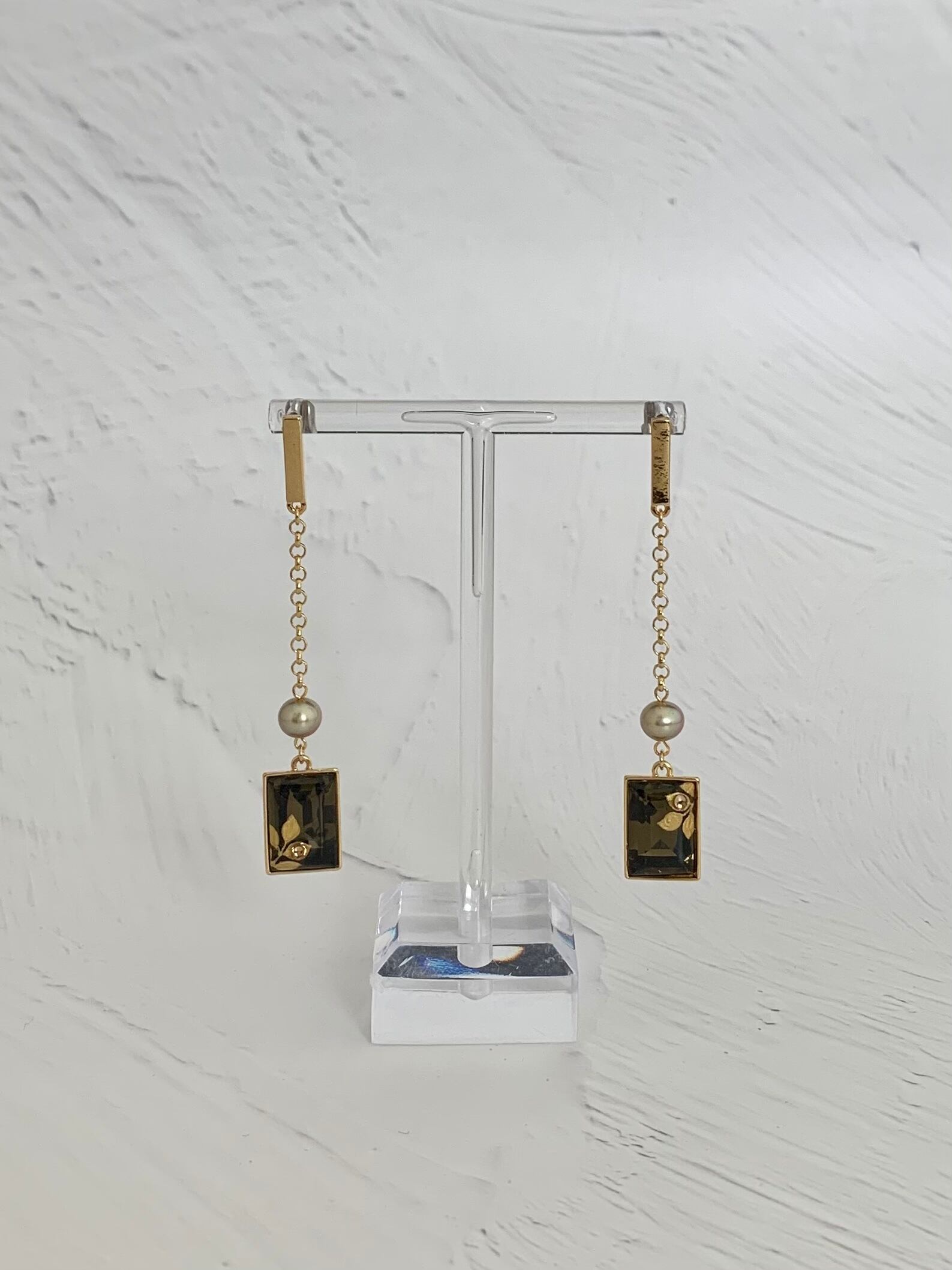 シャープな印象の長方形のクリスタルに葉を描き、細かなスワロフスキーを散りばめ、ロングピアスに仕上げました。